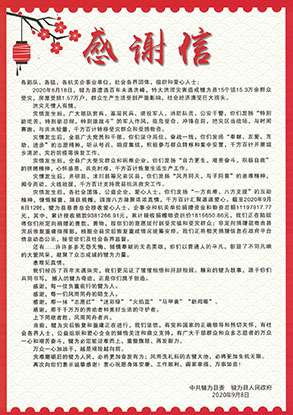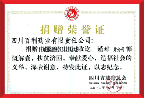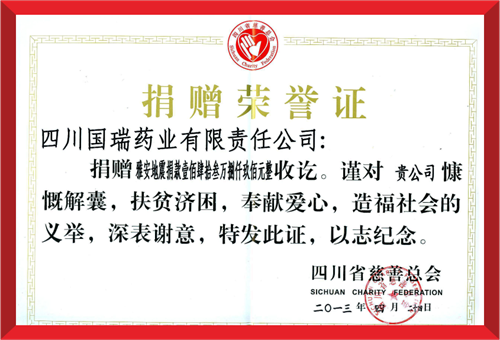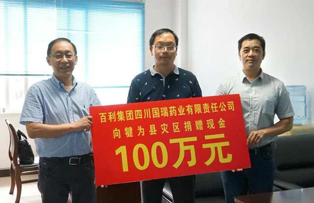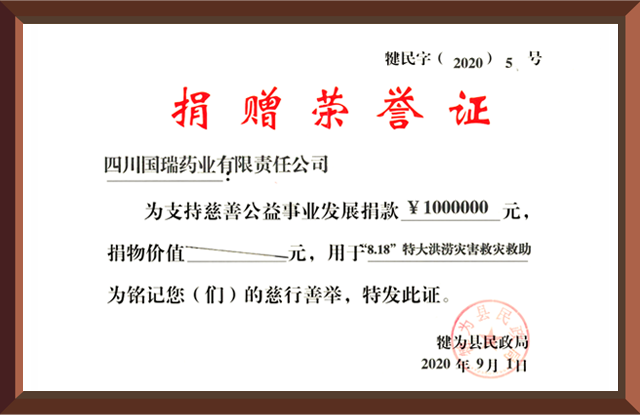 2020年8月18日,四川省犍为县遭遇百年未遇特大洪涝灾害,昆明任波保洁清洗服务有限公司集团国瑞药业向犍为县灾区捐赠现金100万元。